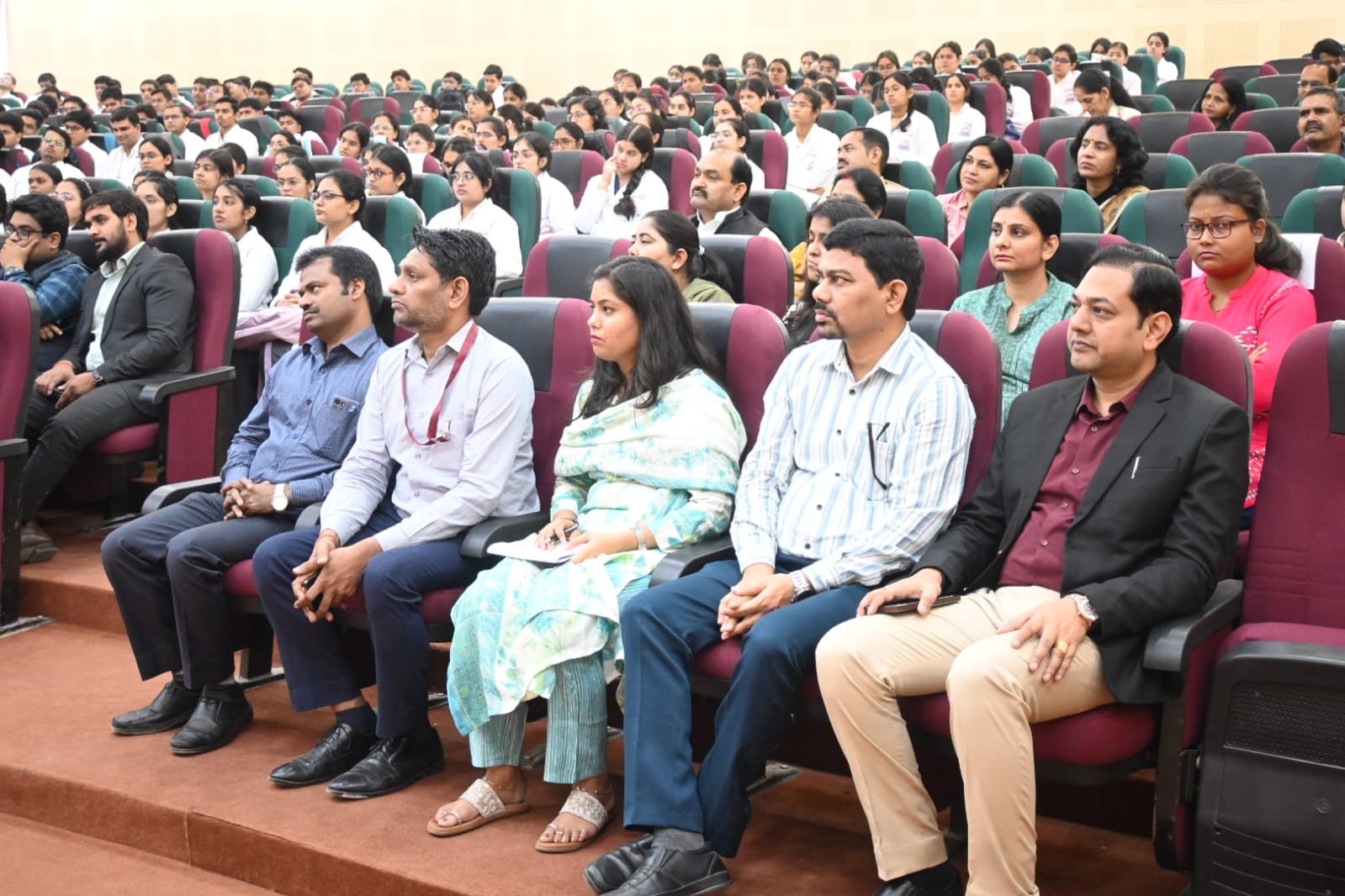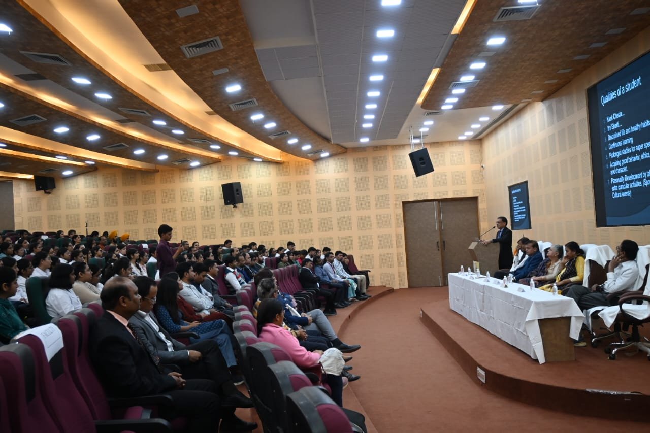 The ceremony began with a traditional lamp-lighting before the idol of Goddess Saraswati, accompanied by a soulful Saraswati Vandana by second-year MBBS students. University dignitaries such as Chancellor Dr. Keshav Kumar Agarwal, Pro-Chancellor Dr. Ashok Kumar Agarwal, Vice-Chancellor Dr. Kiran Agarwal, and BIU Vice-Chancellor Dr. Lata Agarwal, along with Principal and Dean Dr. (Col) Ravindra Nath Shukla, inaugurated the event. The Chief Guest emphasized integrity, discipline, and empathy as essential traits of a doctor, urging students to learn not only from books but also from their patients’ experiences.Chancellor Dr. Keshav Kumar Agarwal and Pro-Chancellor Dr. Ashok Kumar Agarwal inspired students to view medicine as a lifelong commitment to humanity rather than a mere career choice. They encouraged students to embrace discipline, sensitivity, and continuous learning. Vice-Chancellor Dr. Kiran Agarwal and BIU Vice-Chancellor Dr. Lata Agarwal motivated the students with poetic and heartfelt messages, highlighting the nobility and responsibility of the medical profession.