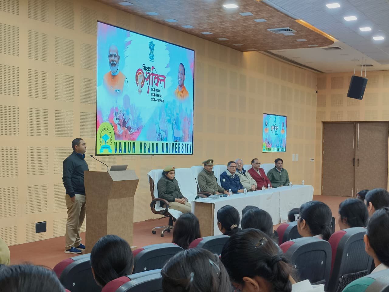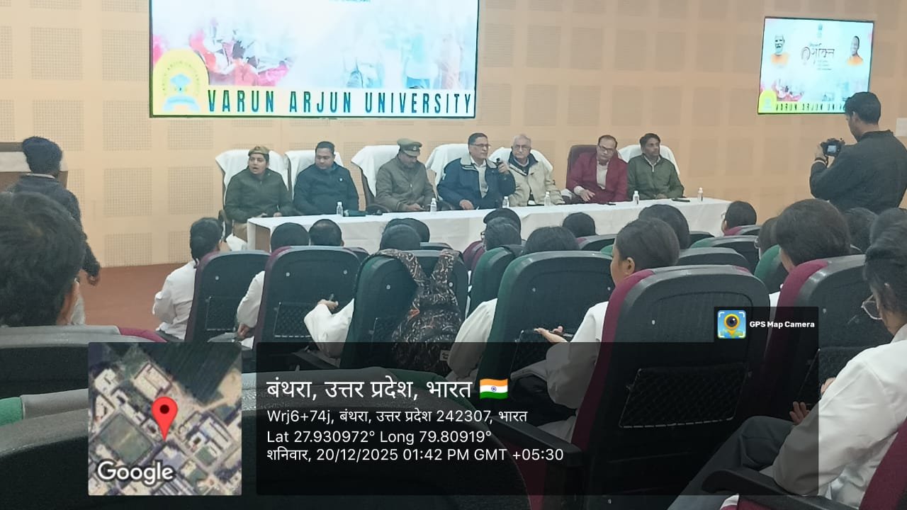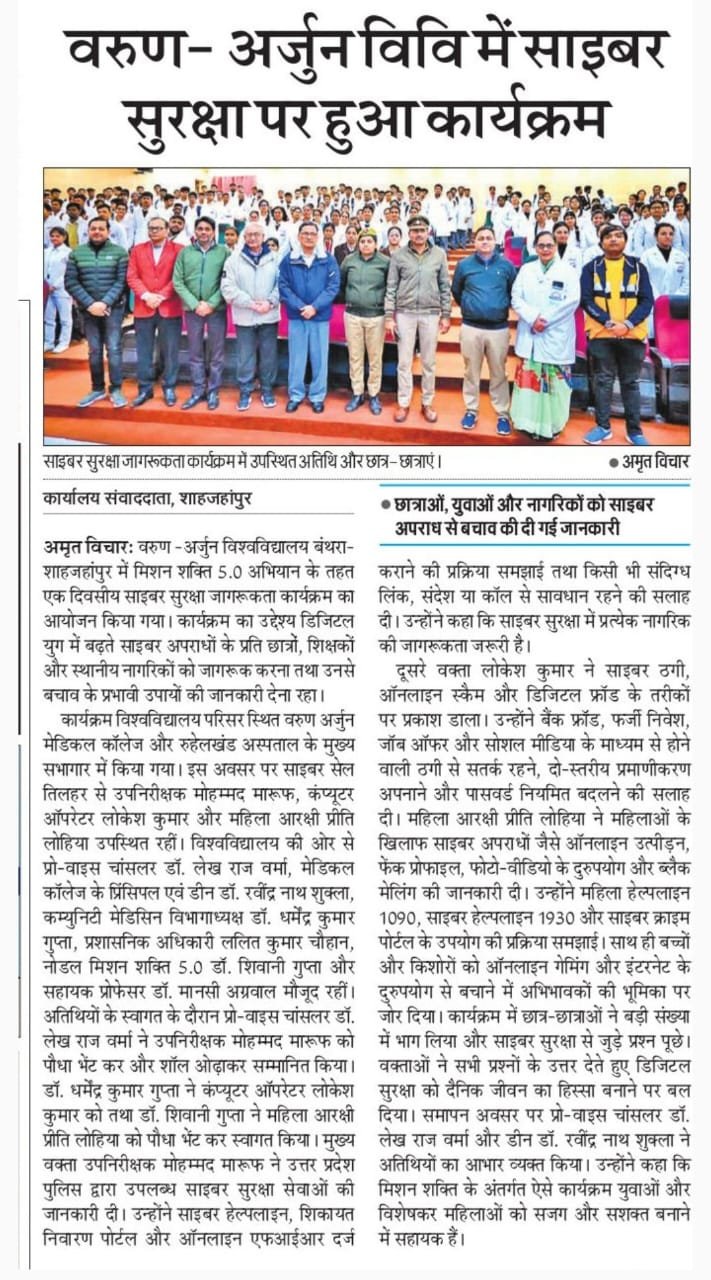 Varun Arjun University, Banthra‑Shahjahanpur, successfully organized a one‑day Cyber Security Awareness Program on December 20, 2025, under the “Mission Shakti 5.0” initiative. The program, led by Nodal Officer Dr. Shivani Gupta, was filled with energy and purpose, focusing on empowering students, teachers, and citizens with knowledge about digital safety and cybercrime prevention.Key speakers — Sub‑Inspector Mohammad Maroof, Computer Operator Lokesh Kumar, and Woman Constable Preeti Lohia from the Cyber Cell Tilhar — delivered insightful sessions on online frauds, cyber helplines, and safe digital practices. Students actively participated, raising thoughtful questions on data protection, online scams, and social media safety.The university’s senior management appreciated the initiative, emphasizing that education must go beyond academics to build a safe, aware, and empowered society. Under the graceful coordination of Dr. Shivani Gupta, the event concluded with the strong message that “Cyber security is everyone’s responsibility, and awareness is our greatest defense.”