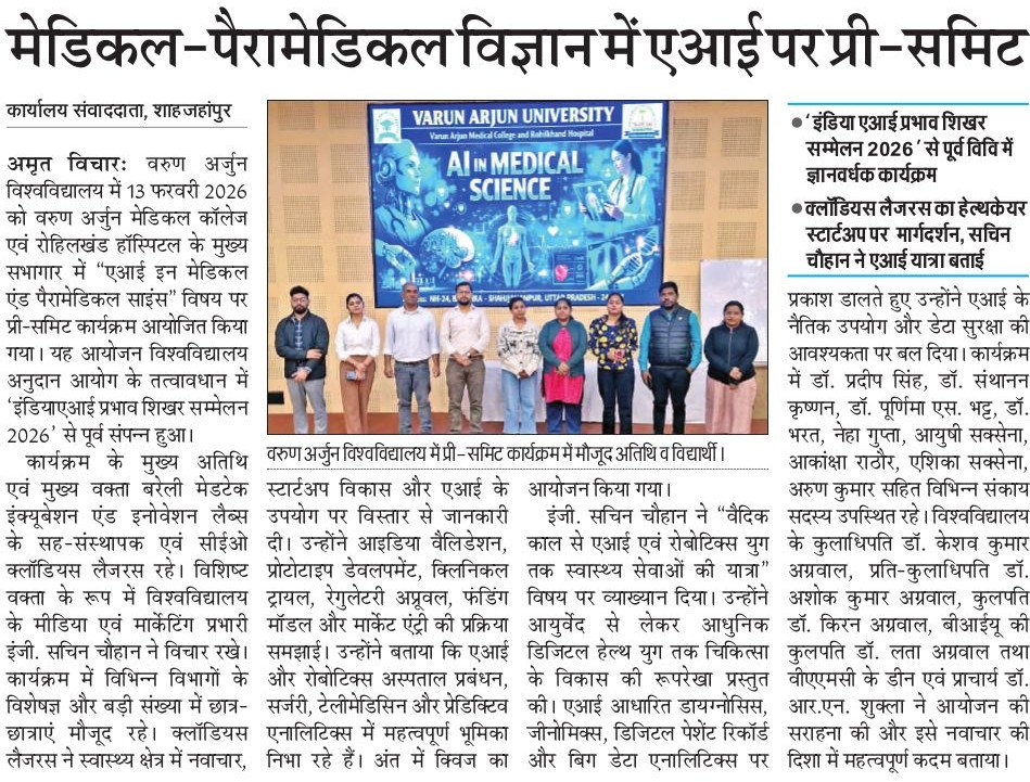 On 13 February 2026, Varun Arjun University, Shahjahanpur (U.P), organized a grand program on “AI in Medical and Paramedical Science” at the main auditorium of Varun Arjun Medical College and Rohilkhand Hospital. Conducted as a Pre-Summit activity under the University Grants Commission (UGC) ahead of the IndiaAI Impact Summit 2026, the event aimed to integrate medicine and technology and inspire innovation in healthcare.