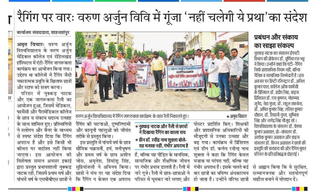 Varun Arjun University, Shahjahanpur organized a highly inspiring and sensitive awareness rally on the occasion of Indian National Organ Donation Day. The event was a reflection of the university’s deep commitment to social responsibility and medical care. The rally was aimed not only at highlighting the scientific aspects of organ donation but also to promote awareness and positive thinking among the general public. The main focus of the event was Varun Arjun Medical College and Rohilkhand Hospital campus, where the rally formally began with the chief guest and Dean and Principal of the Medical College, Dr. (Colonel) Ravindranath Shukla gave the green signal for the rally.