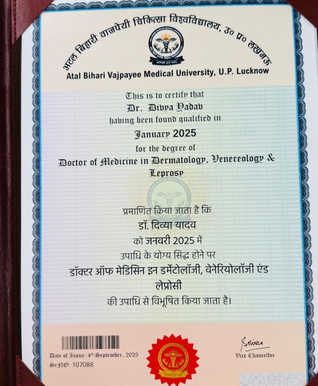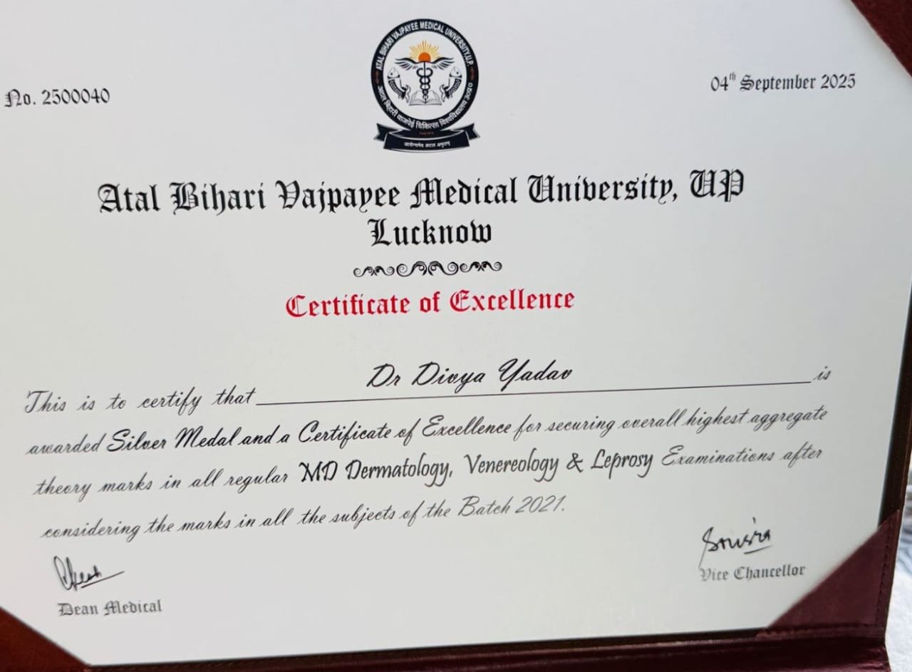 Dr. Divya Yadav Receives Silver Medal in Dermatology Exam