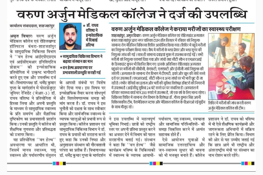 The college administration and Community Medicine Department lauded Dr. Raghav Vashisth for his dedication, discipline, and professionalism, calling his efforts a matter of pride for the institution. Dr. Gupta’s mentorship was acknowledged as instrumental in fostering an encouraging academic environment and guiding students toward national-level platforms. The institute emphasized that such initiatives cultivate in future physicians a broader understanding of health as an ecological and societal concept. The achievement symbolizes not only individual merit but also the collective excellence of the department, reinforcing Varun Arjun Medical College’s vision of quality medical education, social responsibility, and innovation in public health.