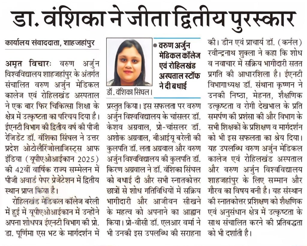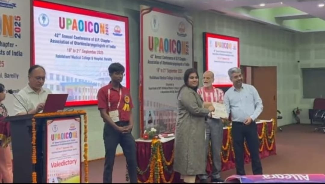 Dr. Vanshika Singhal, 2nd-year Post Graduate Resident, Department of ENT, secured the 2nd Prize in the Post Graduate Award Paper Presentation at the 42nd Annual State Conference of the UP Chapter of the Association of Otolaryngologists of India (UPAOICON 2025), held at Rohilkhand Medical College, Bareilly from 19th-21st September 2025.