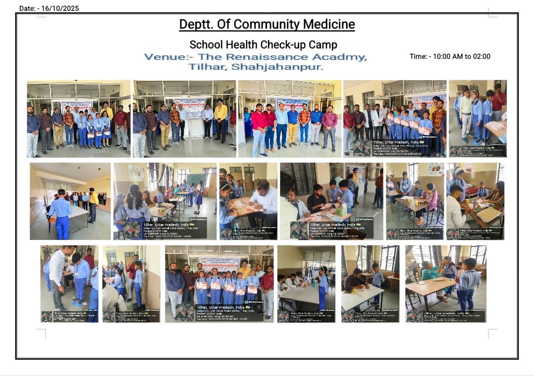 Under Varun Arjun University, Banthra–Shahjahanpur, the Department of Community Medicine of Varun Arjun Medical College and Rohilkhand Hospital organized a free student health check-up camp at The Renaissance Academy, Tilhar. Held on October 16, 2025, the camp witnessed the participation of 275 students who underwent general health, eye, dental, and ENT examinations. Expert doctors provided essential medical consultations and distributed free medicines to those in need. Led by Dr. Dharmendra Kumar Gupta, the camp also emphasized the importance of hygiene, balanced nutrition, and regular exercise for students’ overall well-being.