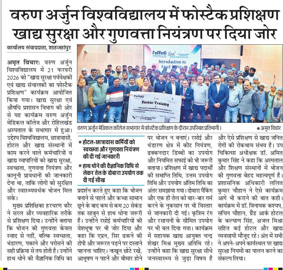 On February 21, 2026, a significant FoSTaC training program for food safety supervisors and operators was organized by the Food Safety and Drug Administration (FSDA), Shahjahanpur, at the Varun Arjun Medical College auditorium. The session aimed to train staff and traders on hygiene, quality control, and legal provisions to ensure safe food across hostels and local establishments.
