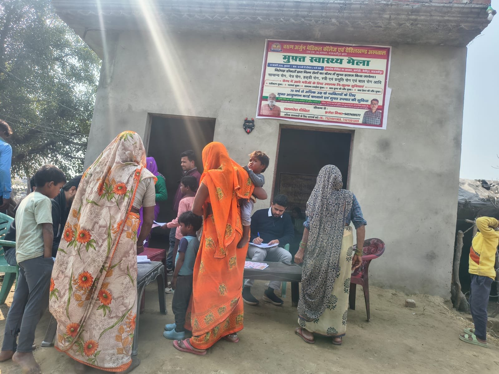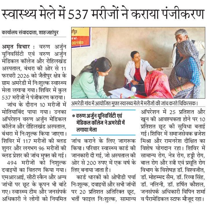 Varun Arjun University, Varun Arjun Medical College & Rohilkhand Hospital, Banthra, Shahjahanpur, organized a free health fair on February 11, 2026 (Wednesday) in Amredi village, Jaitipur area. A total of 537 patients registered at the camp, with 10 diagnosed with cataracts and scheduled for free surgery at the hospital; 117 received free blood sugar tests, 96 had free blood pressure checks, and 494 patients got free medicines along with discount coupons for MRI, CT scans, and other diagnostics. The health team and PRO raised awareness on regular check-ups and the Family Health Card (₹200, valid for 1 year), which provides free OPD slips and admission files, 20% discounts on medicines/tests, 25% off general surgeries, and 10% off blood requirements, while highlighting free beds, nursing care, consultations, and 24/7 affordable services like surgeries, ICU, ventilators, dialysis, MRI/CT/ultrasound. Social workers Brajesh Mishra and Ramnaresh Dixit made notable contributions, with specialists Dr. Vishwajeet, Dr. Mohammad Sam, Dr. Rivya Singh, Dr. Nalini, Dr. Harshit Kaushal (from General Medicine, Ophthalmology, Orthopedics, Pediatrics, Obstetrics), PRO Vipin Sharma, and paramedical staff present.