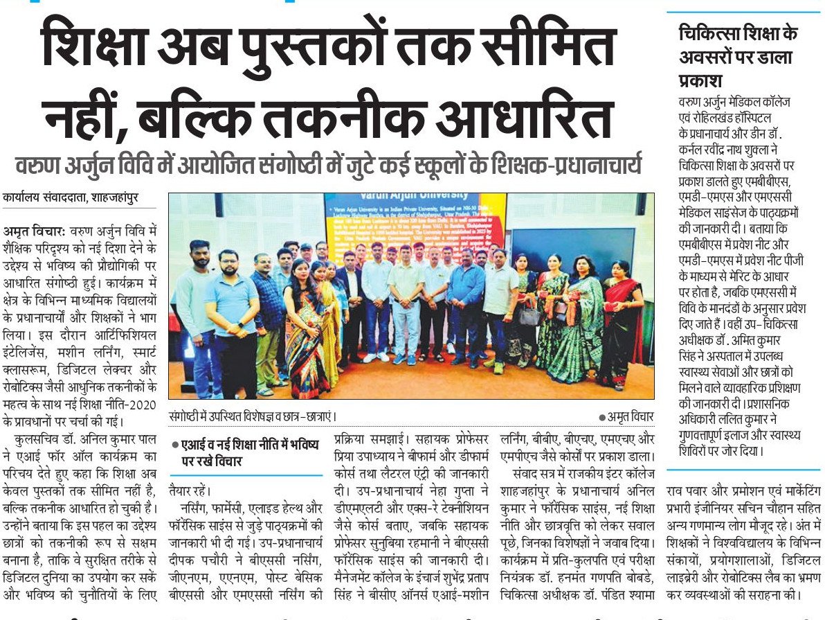 On 4th April 2026, Varun Arjun University, Shahjahanpur, organized a large-scale seminar on Integration of Future Technologies in Education, reaffirming its commitment to NEP-2020’s vision of skill-based, tech-enabled learning.The seminar underscored the growing role of Artificial Intelligence, Machine Learning, robotics, and digital platforms in reshaping academic delivery.