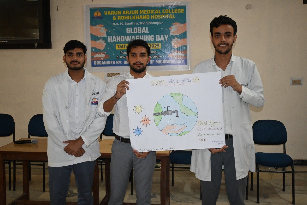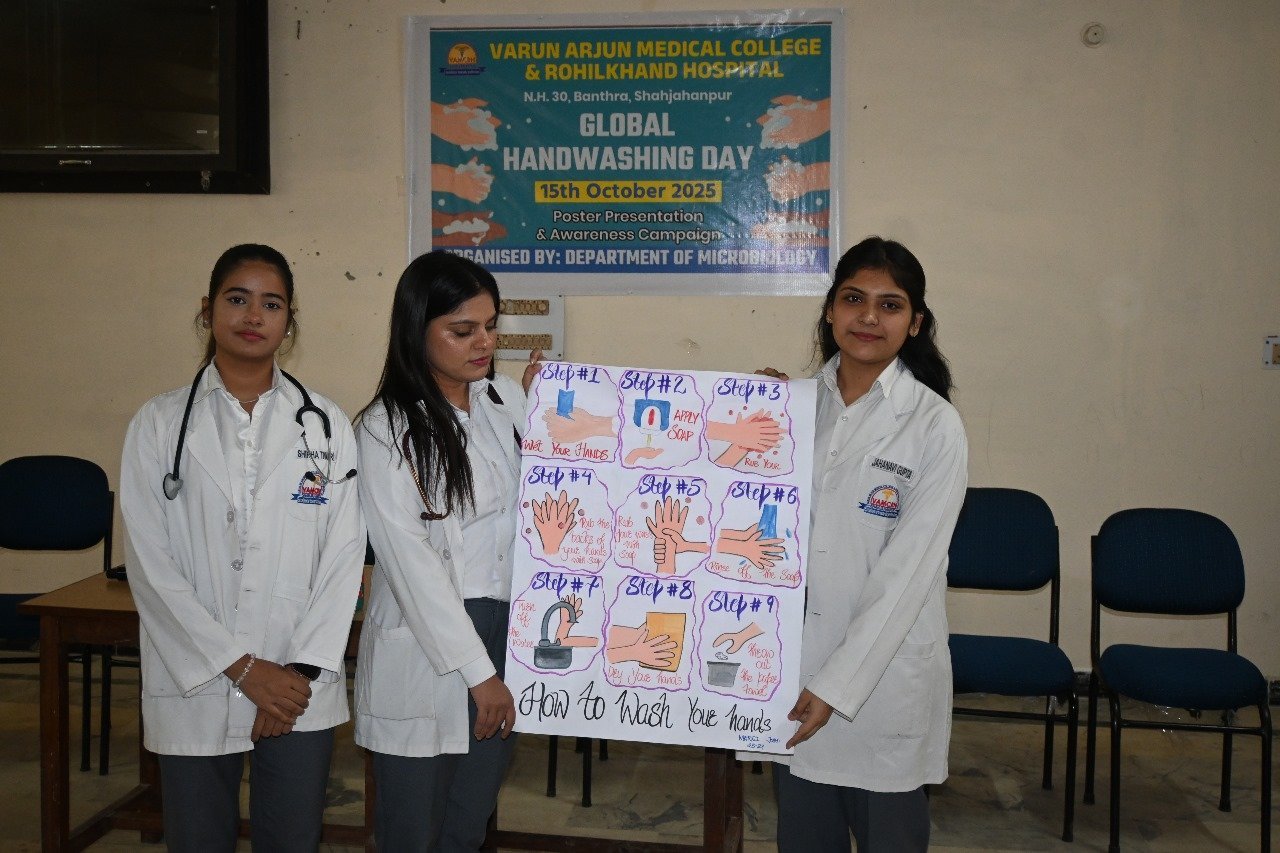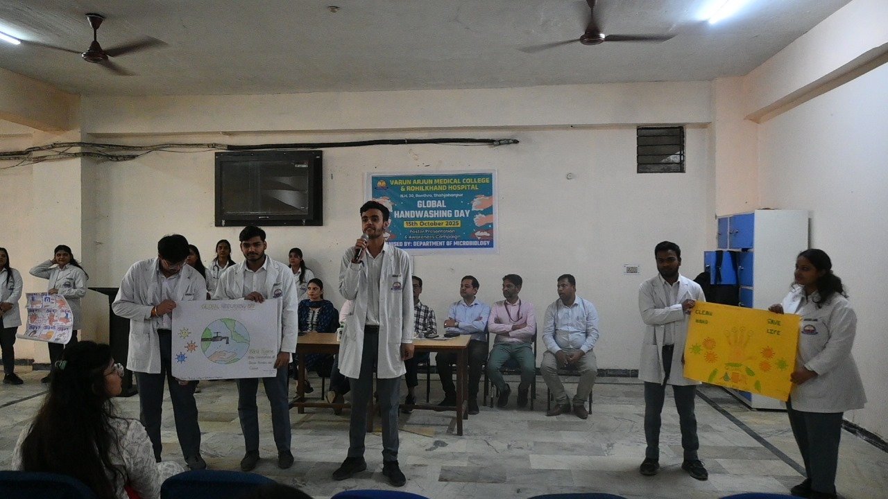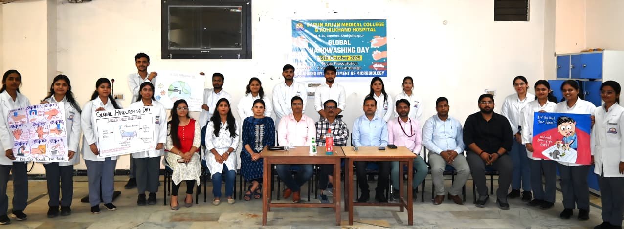 The Department of Microbiology at Varun Arjun Medical College & Rohilkhand Hospital, Shahjahanpur, organized an awareness program on the occasion of Global Handwashing Day. The objective of this program was to raise public awareness about the importance of hand hygiene and cleanliness.