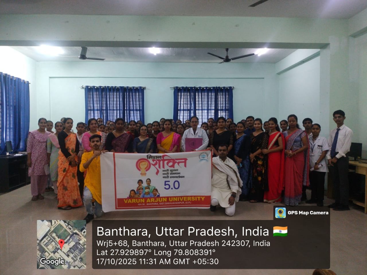 Varun Arjun University, Banthra–Shahjahanpur, organized the “Mission Shakti – Phase 5.0” program on October 17, 2025, with great enthusiasm to promote women’s empowerment. Around 150 students from Varun Arjun College of Nursing actively participated, showcasing themes of self-reliance, leadership, and women’s social roles through creative presentations. The event aimed to inspire confidence, leadership qualities, and social awareness among female students.