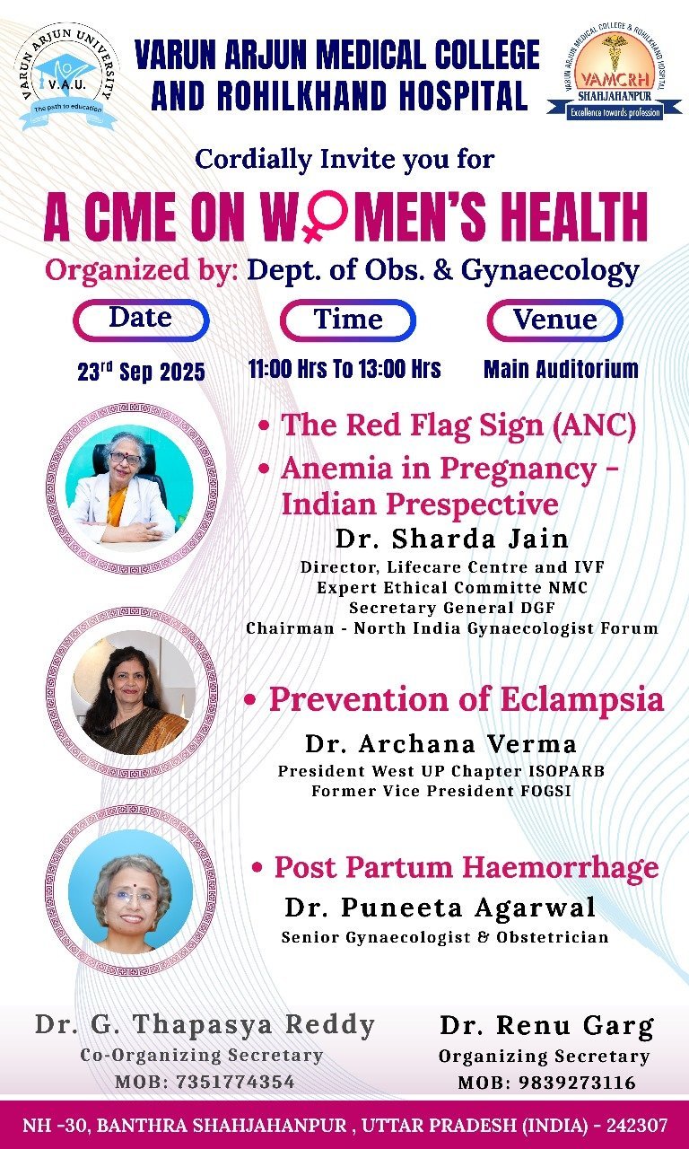 The Department of Obstetrics & Gynaecology, Varun Arjun Medical College & Rohilkhand Hospital, Shahjahanpur, U.P., will be organizing a Continuing Medical Education (CME) program on women’s health, under the Swasth Nari, Sashakt Parivar Abhiyan 2025. The event is set to take place on 23rd September 2025 from 11:00 AM to 1:00 PM in the Auditorium. The program will include expert sessions on crucial topics such as The Red Flag Sign (ANC) and Anemia in Pregnancy – Indian Perspective, delivered by Dr. Sharda Jain, Director of Lifecare Centre and IVF, Expert Ethical Committee NMC, Secretary General DGF, and Chairman of the North India Gynaecologist Forum. Other sessions will cover Prevention of Eclampsia by Dr. Archana Verma, President of the West UP Chapter ISOPARB and former Vice President of FOGSI, and Post Partum Haemorrhage by Dr. Puneeta Agarwal, Senior Gynaecologist & Obstetrician. In addition to the CME, there will be a series of health initiatives for the general public, including women’s screening, free Hb testing, free IFA supplements, and deworming tablets distribution, awareness and counseling sessions on anemia prevention and menstrual hygiene. The CME is organized by Professor Dr. Renu Garg (Organizing Secretary). This event promises to offer valuable insights into the management of key women’s health issues while contributing to ongoing medical education and professional development in the field.