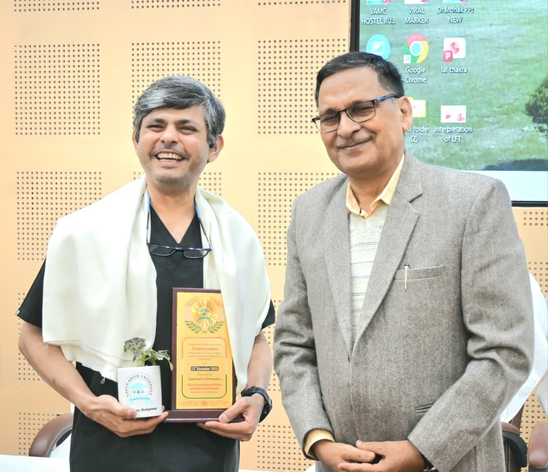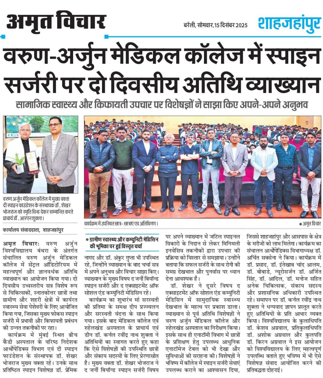 Varun Arjun Medical College, under Varun Arjun University, Banthra, Shahjahanpur, successfully organized a two-day guest lecture on December 13, 2025, at its Central Auditorium. The session focused on advanced and affordable techniques in spine surgery and was designed for physicians, postgraduate students, and healthcare professionals. The keynote presentation was delivered by Dr. Shekhar Bhojraj, Senior Director (Orthopedics) at Breach Candy Hospital and Founder of The Spine Foundation, Mumbai. Accompanying him were renowned spine experts Dr. Premik Nagad and Dr. Ankur Gupta, who also contributed to the discussion.