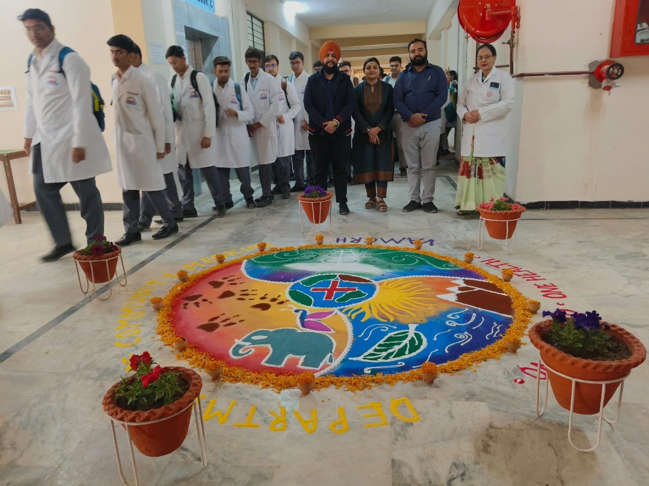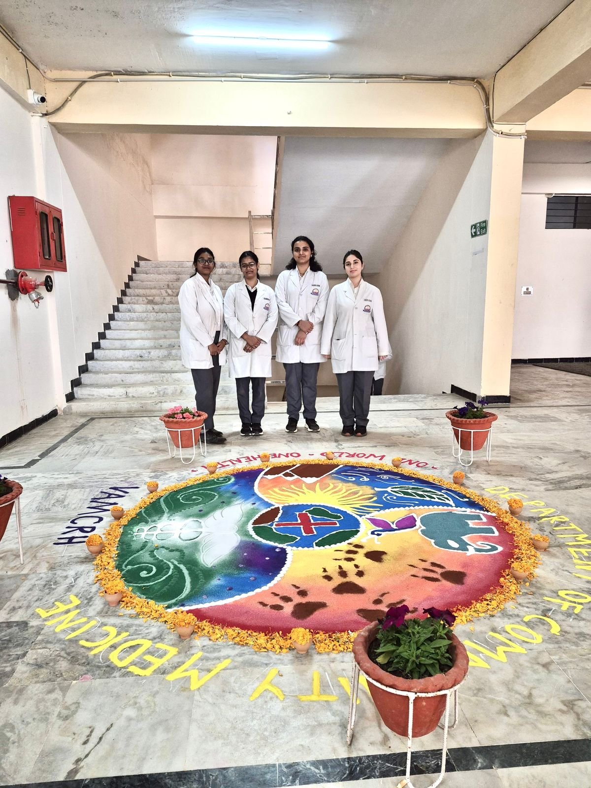 The UG students of the college prepared poster presentations and a welcoming rangoli, adding color and creativity to the event. The program commenced with a soulful recital of Saraswati Vandana, performed by UG students, setting a devotional and inspiring tone.