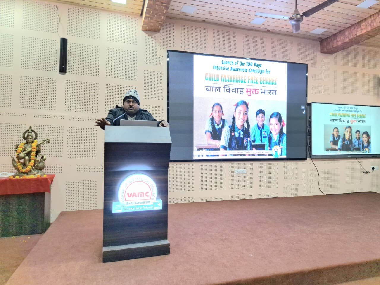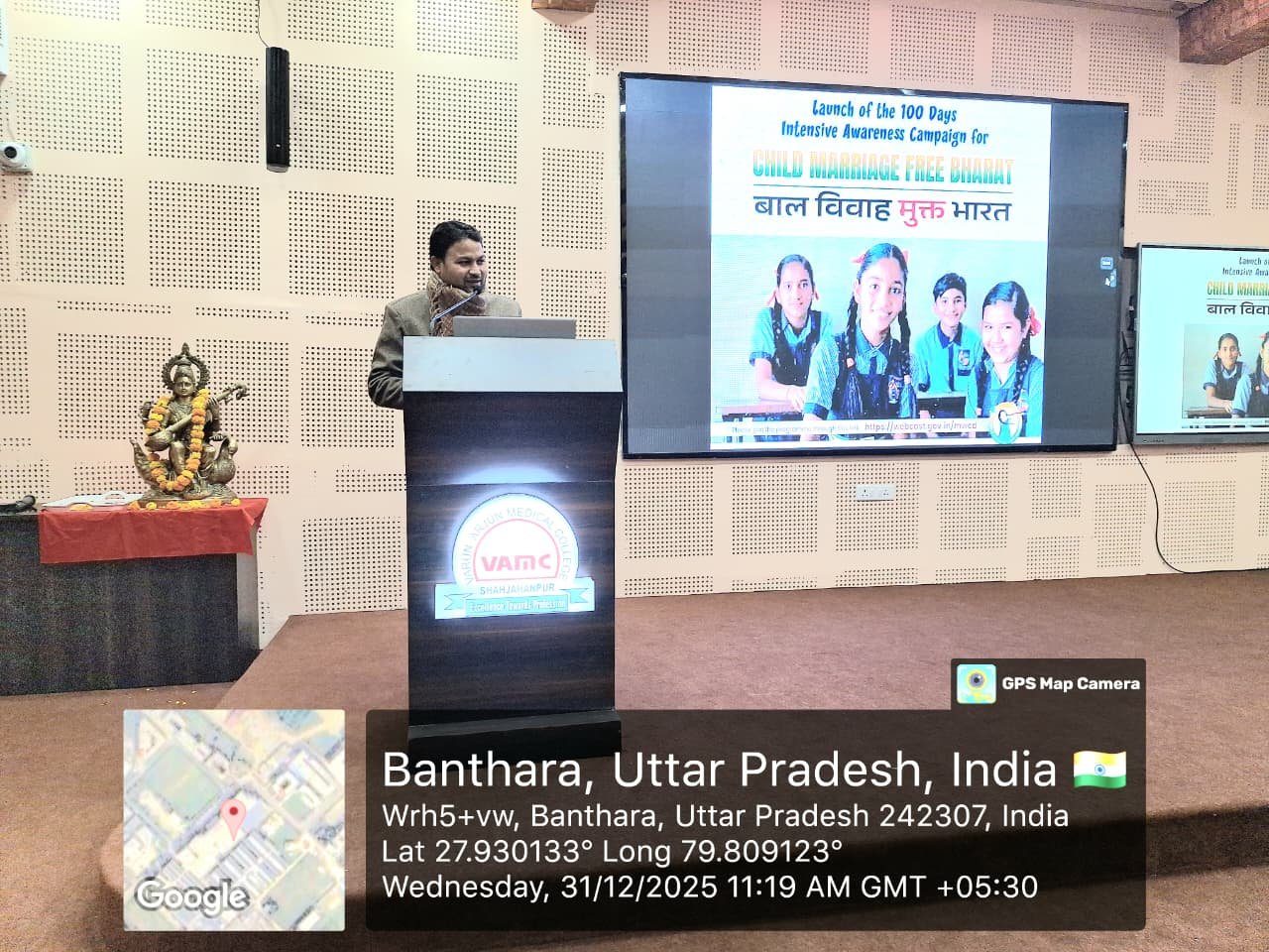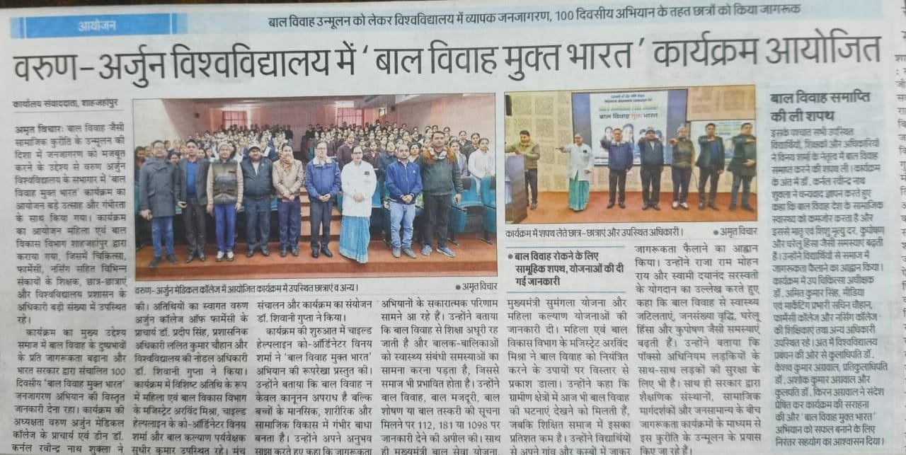 Varun Arjun University Organizes Awareness Program on “Child Marriage Free India”Varun Arjun University, Banthra–Shahjahanpur, hosted an impactful awareness program titled “Child Marriage Free India”, organized in collaboration with the Department of Women and Child Development, Shahjahanpur. The event aimed to educate students and faculty about the ill effects of child marriage and promote the Government of India’s 100-day nationwide awareness campaign against it. The program was presided over by Dr. (Col.) Ravindra Nath Shukla, Principal and Dean of Varun Arjun Medical College, while distinguished guests included Mr. Arvind Mishra (Magistrate, Women & Child Development Department), Mr. Vinay Sharma (Coordinator, Child Helpline), and Mr. Sudhir Kumar (Child Welfare Supervisor). Dr. Shivani Gupta, the university’s nodal officer for the campaign, skillfully coordinated and hosted the event.In his address, Mr. Vinay Sharma elaborated on the seriousness of child marriage, calling it not only a legal offence but also a barrier to the mental and physical development of children. He urged students to take an active role in preventing child marriages and shared details about government helplines (112, 181, 1098) and welfare schemes such as Mukhyamantri Bal Seva Yojana and Mukhyamantri Sumangala Yojana. Mr. Arvind Mishra, in his inspirational speech, highlighted that child marriage persists mainly in rural areas and emphasized the role of education, awareness drives, and youth participation in eliminating this social evil. He invoked reformers like Raja Ram Mohan Roy and Swami Dayanand Saraswati as examples of visionaries who fought for women’s rights and education.Towards the conclusion, participants took an oath led by Mr. Vinay Sharma to work toward ending child marriage. Dr. (Col.) Ravindra Nath Shukla delivered the vote of thanks, stressing that child marriage weakens the social fabric and leads to serious health and social issues. The program saw participation from faculty and students across Medicine, Pharmacy, and Nursing, including Dr. Pradeep Singh, Mr. Lalit Kumar Chauhan, and faculty members such as Ms. Akanksha Rathaur, Ms. Khushboo Singh, and Ms. Priya Mishra. The university’s leadership — Dr. Keshav Kumar Agarwal (Chancellor), Dr. Ashok Kumar Agarwal (Pro-Chancellor), and Dr. Kiran Agarwal (Vice-Chancellor) — praised the initiative, reaffirming their commitment to societal awareness and positive change through education.
