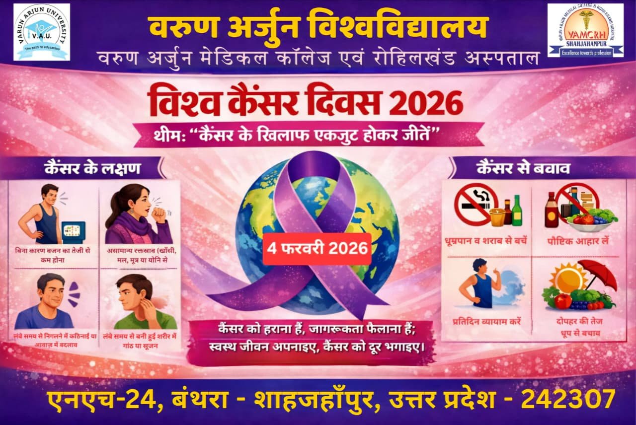 Varun Arjun Medical College & Rohilkhand Hospital, under Varun Arjun University, Shahjahanpur, observed World Cancer Day 2026 with a comprehensive public awareness initiative and an academic lecture series aimed at promoting cancer prevention, early detection, and public sensitization.
