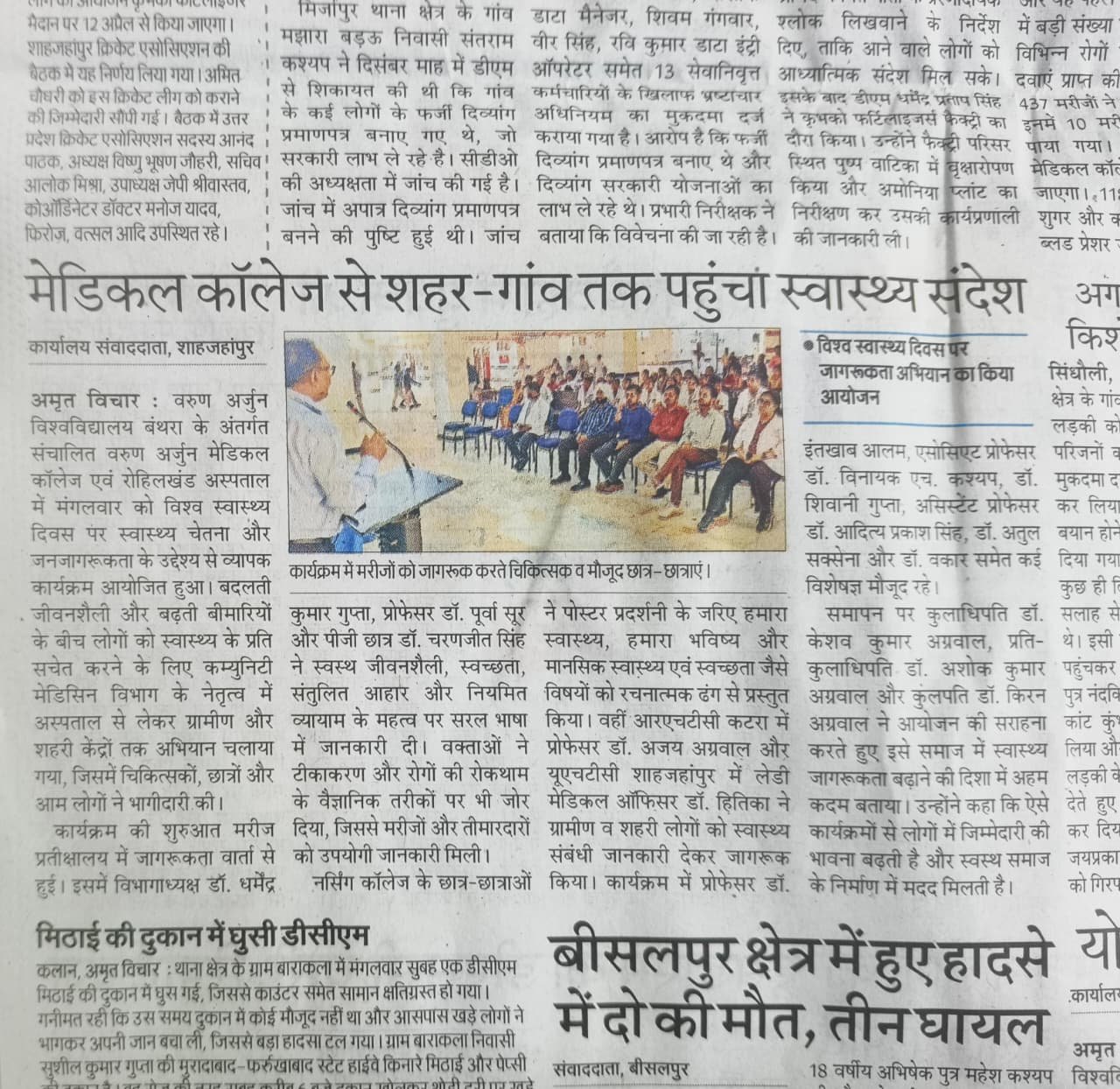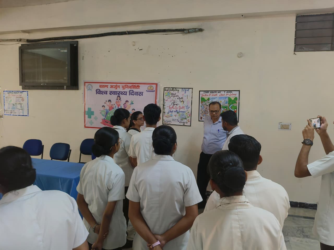 Varun Arjun University, Banthra–Shahjahanpur, through its Varun Arjun Medical College and Rohilkhand Hospital, organized a large-scale and impactful program on April 7, 2026, to mark World Health Day. Led by the Community Medicine Department, the initiative focused on spreading awareness about healthy lifestyles, hygiene, nutrition, exercise, and vaccination. The program began with an awareness session in the hospital waiting area, where Dr. Dharmendra Kumar Gupta (Head of Department) emphasized that “health is the real wealth.” He was joined by Dr. Purva Sur and Dr. Charandeep Singh Dua, who provided practical guidance to patients and their attendants. Nursing students also showcased creative posters on themes like “Our Health, Our Future” and mental health, promoting preventive healthcare in an engaging manner.