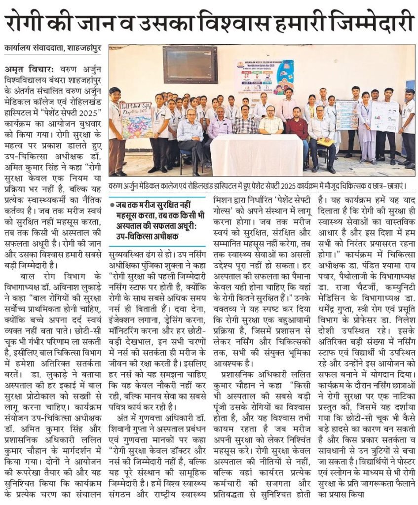 A program on “Patient Safety 2025” was organized on the Occasion of World Safety Day with great enthusiasm and seriousness on September 17, 2025, at the Varun Arjun Medical College & Rohilkhand Hospital, under the Varun Arjun University, Banthra-Shahjahanpur.